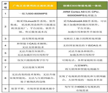 以創維E800智能電視一體機為例,與廣電正在使用的機頂盒比較