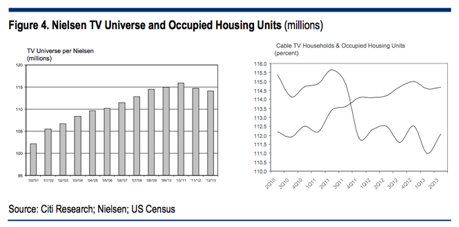 這些來自花旗研究機(jī)構(gòu)的圖表顯示,全球觀看電視的人數(shù)正在減少。值得指出的是,美國的家庭數(shù)量仍在增加,但是訂閱有線電視的家庭數(shù)量卻在減少。