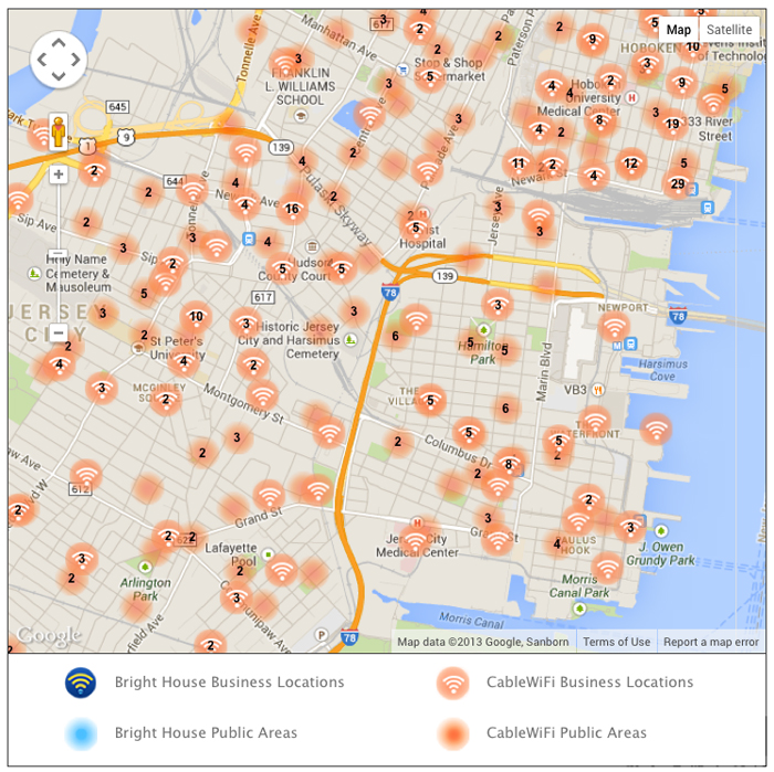 圖中顯示的是美國新澤西州澤西城提供的免費(fèi)Wi-Fi熱點(diǎn)分布情況。據(jù)跟蹤和繪制Wi-Fi熱點(diǎn)的公司Bright House Networks稱,美國大多數(shù)人口稠密的地方均擁有類似這樣密集的Wi-Fi熱點(diǎn)分布。
