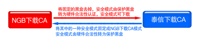 站在必須采用黑盒安全保護的角度,因為泰信下載CA可以沒有黑盒,所以與NGB下載CA沒有關系;站在算法、密鑰可變換的角度考慮,當泰信下載CA采用與NGB下載CA相同的固化算法密鑰,并用固定黑盒保護的時候,NGB下載CA就是泰信下載CA的一種情況。
