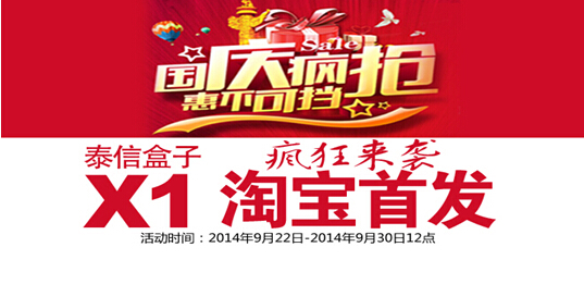 淘寶促銷篇:泰信盒子X1于9月20日在淘寶官方店全球震撼首發。此次國慶前夕,繼續加大促銷力度,在優惠直降300元的基礎上還送AV線套裝。詳情:http://shop112060586.taobao.com/
