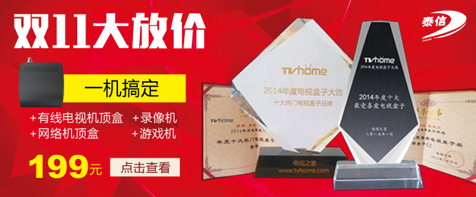 技術(shù)創(chuàng)新贏得產(chǎn)品領(lǐng)先!泰信盒子是國內(nèi)首款集廣電有線電視、網(wǎng)絡(luò)電視、錄像機(jī)、游戲機(jī)于一體的全國市場化銷售的融合型智能機(jī)頂盒。泰信盒子X2榮膺2014年度十大最受喜愛的電視盒子及品牌。爆款好機(jī)惠迎國慶,購機(jī)不必等到雙11!心動的小伙伴千萬不要錯過哦!