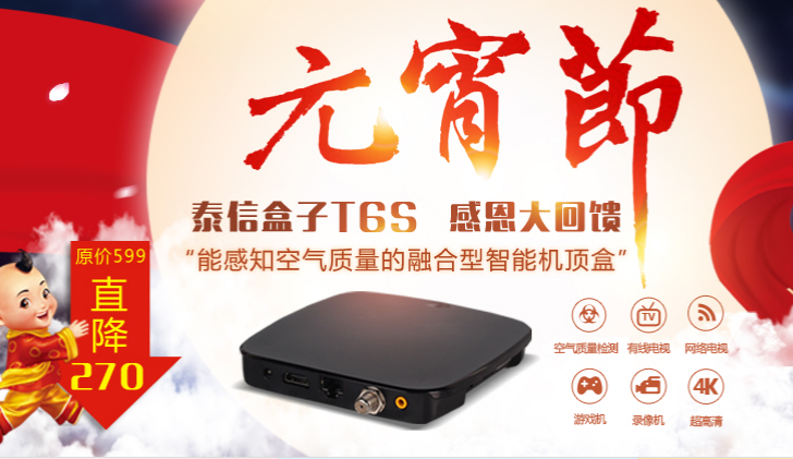 此次在元宵佳節(jié)來臨之際,泰信盒子T6S以前所未有的冰點(diǎn)價(jià)回饋新老客戶,直降270元,讓這款承載技術(shù)創(chuàng)新的感知室內(nèi)空氣質(zhì)量的智能機(jī)頂盒走向千家萬戶,造福百姓。更多詳情請及時(shí)關(guān)注泰信官方網(wǎng)站。
