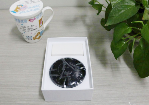 主機(jī)為黑色塑料材質(zhì),飛碟造型,頂面為鋼琴烤漆,中央圓環(huán)區(qū)為紅外學(xué)習(xí)接收窗口。