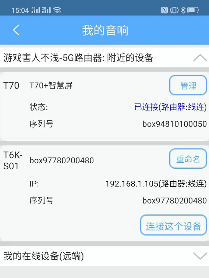 T70和手機連接相同的路由器,手機打開泰信智能家居APK,在我的\我的設備中,連接T70(我已將T70名稱改為“T70+智慧屏”)。