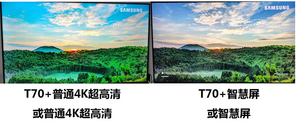 使用T70、普通4K超高清電視和智慧屏分別播放一段三星67Mbps的4K超高清視頻。這段視頻是HDR1000格式(專業、愛好者級別的HDR),10bit、H.265壓縮,是目前能找到的碼流速度最高的4K超高清信號源,在同一時刻手機拍照: