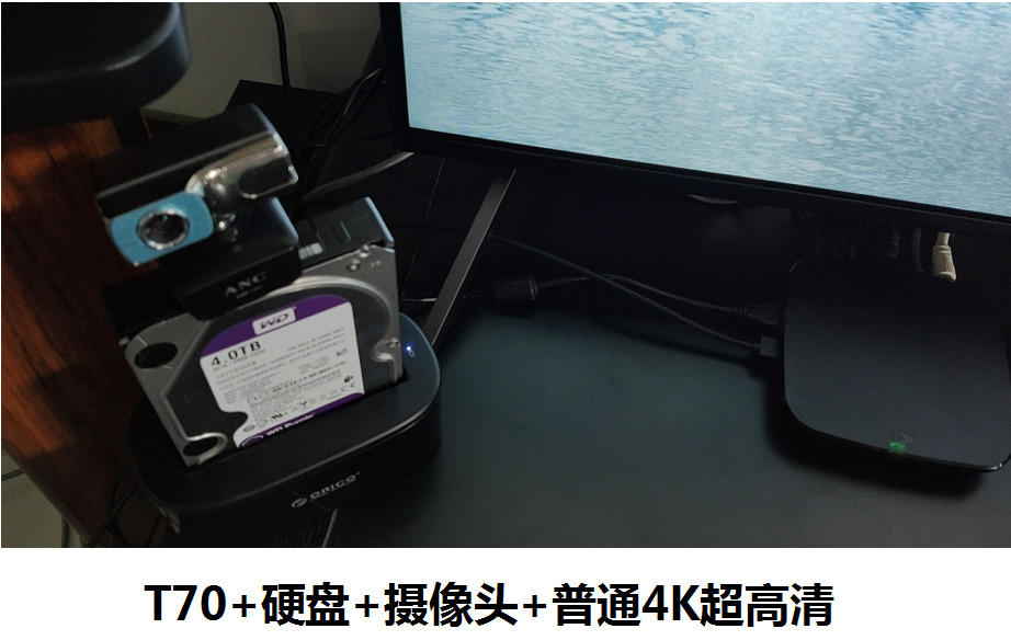這是插在T70上存儲照片和視頻的4T硬盤及硬盤盒。硬盤盒上有電源開關,在需要的時候打開電源,不用擔心隱私泄露。如果T70在10分鐘左右不操作硬盤,硬盤停止轉動
