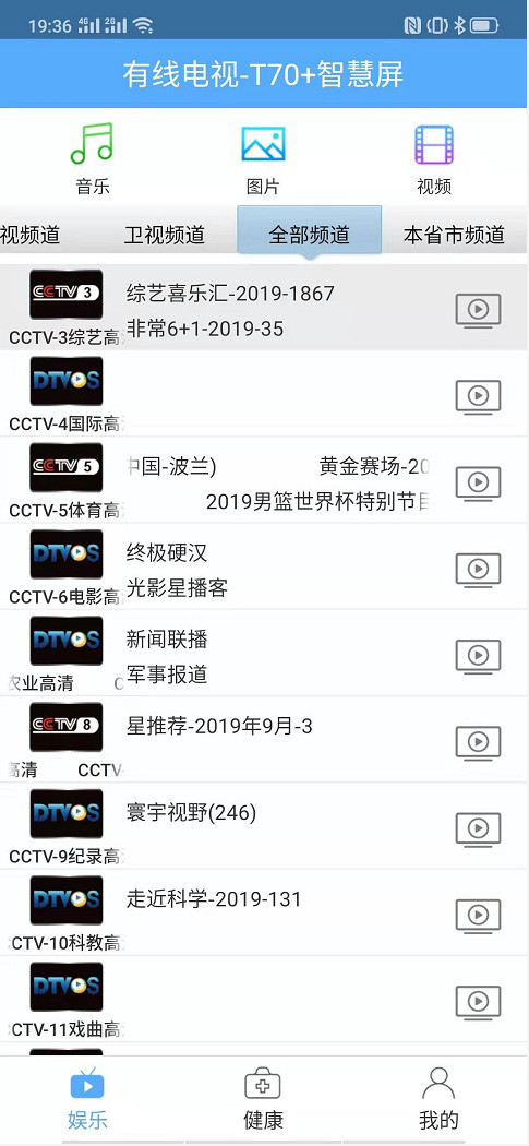 這是手機切換T70直播頻道的操作界面。在看電視的時候,可在手機上查看電子節目指南(EPG)信息,并選擇要看的直播頻道。