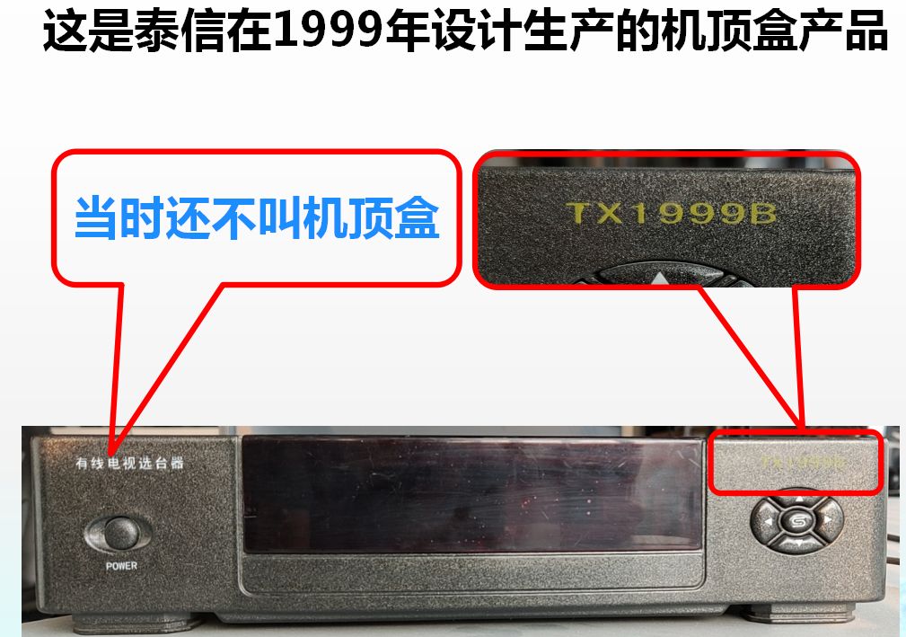 TX1999B是泰信在1999年生產(chǎn)的一款“有線電視選臺(tái)器(機(jī)頂盒的曾用名)”。此后,Digital Set Top Box(數(shù)字機(jī)頂盒的英文)技術(shù)開始從國(guó)外引入中國(guó)。“選臺(tái)器、機(jī)上變換器、上下變頻器”的老稱謂逐漸被“機(jī)頂盒”代替。讓人意想不到的是,這款20年前生產(chǎn)的TX1999B,在通電后還能正常工作(點(diǎn)擊了解更多)。